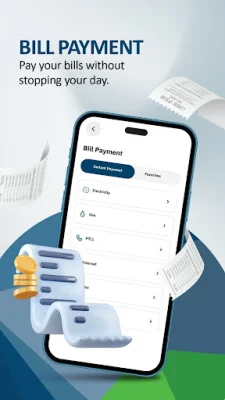 For easy and secure payments, the app offers a QR based scan-and-pay functionality. Users can also make utility bill and government fee payments directly from the app. The beneficiary management feature allows for faster fund transfers, and users can schedule recurring transactions for added convenience. The app also has a favorites feature for quick payments.