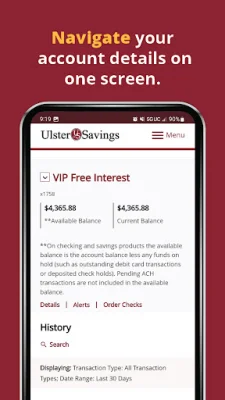 Ulster Savings Bank Mobile Banking is a convenient and secure way to manage your finances on the go. With this mobile application, you can easily review your account balances and transactions, transfer funds between accounts, pay bills, view copies of cleared checks, and locate surcharge-free ATM's and Ulster Savings Bank branches. This app is designed to make banking easier and more accessible for our customers.