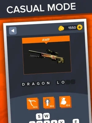 The game is a Counter Strike skin guessing application that is divided into three different modes: Casual, Competitive, and Deathmatch. In Casual mode, players must use the available letters to guess the name of a CSGO skin. There are three hints available to use if the player gets stuck, including adding letters, erasing letters, or filling in the entire name. However, players must use these hints carefully as they are the most expensive option. Casual mode also includes five categories with various achievements that must be completed to unlock locked categories. These achievements can include reaching a certain rank in Counter Strike or guessing all the weapons in a category.