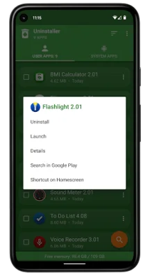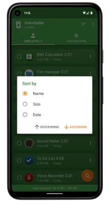 The app offers several useful features, such as the ability to uninstall apps with just one click, support for individual or batch uninstallation (with long press support), and the display of app information such as name, version, installation time, and size. Users can also search for apps, either by typing or using voice search, and sort them by name, size, or installation date in ascending or descending order. There is also a status bar in the notification area for quick access, which can be turned off in the settings. The option menu provides context actions for each app, and users can also view details and search for apps in the Google Play store. Additionally, they can create shortcuts for their favorite apps on their home screen and check the available memory space on their device.