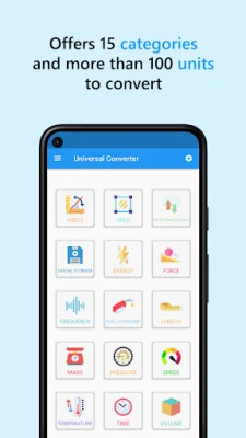 The 15 categories included in Universal Converter cover a wide range of units, including angle, area, data, energy, frequency, force, fuel economy, length, mass, pressure, speed, storage, temperature, time, and volume. This comprehensive list of categories ensures that you can convert any unit you need with ease.