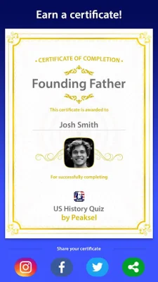 The app features multiple categories covering American History Trivia, providing a comprehensive overview of the nation's past. Helpful hints are also available to guide users through tough moments, and a skip option allows for the challenge to be continued at any time. The heart-based life system adds an element of excitement to the game, and users can share questions with friends for extra support. Certificates are also awarded for completing all quiz levels, adding a sense of accomplishment to the learning experience.