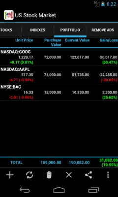 This application allows users to track stocks and indexes from various sources such as Nasdaq, New York Stock Exchange (NYSE), Dow Jones, and S&P. It provides quotes for a majority of US stocks and indexes, including Dow indices, Nasdaq indices, S&P indices, mid cap - small cap indices, and important sectoral indices. Users can also access full portfolio functionality, allowing them to track their stocks and portfolio performance over time.