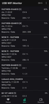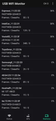 This app is designed for Android devices and requires a USB WiFi adapter with the AR9271 chipset to function properly. This adapter must be connected to the Android device using an OTG USB cable. The app has several features including the ability to show nearby access points and stations, capture WiFi management and data frames, and switch between automatic channel hopping and a fixed channel. It supports 802.11bgn, but not the newer ac standard.