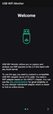 After connecting the adapter, a popup will appear on your device. You will need to grant the app, "USB WiFi Monitor," permission to access the USB device. Once this is done, you can hit the Start button in the app to begin capturing frames. If the capture is stopped due to an error, you will need to unplug and re-plug the adapter.