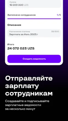 Create a payroll, enter payment amounts, and sign the payment. Salaries will be credited to employees on the same day.