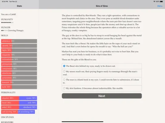 The story centers around rumors of an ancient vampire, Aristovoros, who seeks to overthrow the Masquerade and rule over mortals as a god. As a player, you must navigate this dangerous world and make choices that will determine your fate. Will you align yourself with the powerful Camarilla or the rebellious Anarchs? Will you betray your boss when your long-lost sire returns? Will you use your powers for good or for selfish gain? These are just some of the decisions you will face as you play through the game.