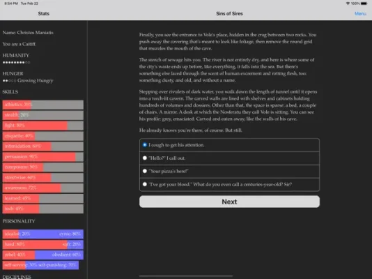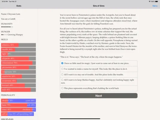 "Vampire: The Masquerade - Sins of the Sires" is a captivating interactive novel written by Natalia Theodoridou. This text-based game boasts an impressive 300,000 words and relies solely on the power of your imagination, without the use of graphics or sound effects. It was even nominated for a Nebula Award for Best Game Writing in the 58th Annual Nebula Awards. The game is set in modern-day Athens, Greece, a city with a rich history and a complex political landscape. In this world, vampires exist and must hide their true nature from mortals in order to maintain the Masquerade, a code of secrecy among the Kindred (vampires).
