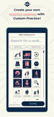 In addition to the Master Class, our application also offers Custom Practice Sessions, a Lightning-Fast Verb Reference, and a unique AI-Powered Sentence Bot. With Custom Practice Sessions, you can choose from curated verb sets or create your own custom sets from all of our infinitives and tenses. The Verb Reference feature allows you to quickly look up a verb in Spanish or English and view all of its forms with just a tap. And with the Sentence Bot, you can generate example sentences to illustrate how the verb conjugation is used.