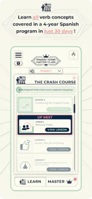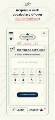 But that's not all! Our Spanish Verbs Master Class is divided into three phases - The Crash Course, The Conjugation Cascade, and The Vocab Expander. Each phase is curated by language experts and learning scientists, making it the most comprehensive verb conjugation class available. In the Crash Course, you will learn all the verb-related grammar concepts covered in a typical 4-year Spanish program. The Conjugation Cascade will teach you 64 of the most important verbs in 12 tenses and moods, while the Vocab Expander will expand your horizons with over 600 infinitives.