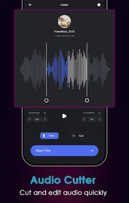 The Audio Tools section of the app includes an audio converter, trimmer, and merger, with support for popular formats such as MP3, WAV, AAC, M4A, and OPUS. It also offers waveform-based cutting and full control over bitrate, making it a useful tool for podcasters and professionals editing sound.