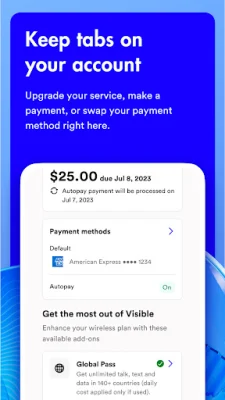Managing your account with Visible is convenient and secure. You can make payments, upgrade your plan, and update your account information all within the app. Plus, you can enroll in Autopay and easily swap payment methods.