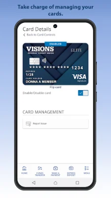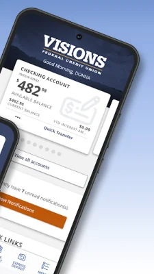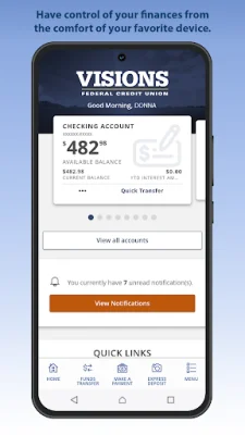 Save yourself time and hassle by using Express Deposit, a feature on our App that allows you to deposit checks by simply taking a picture. No need to make a trip to a Visions office or ATM. But that's not all our App has to offer. You can also access other convenient functions such as Transactions, Pay Bills, Account Balances/History, Branch & ATM Locator, Card Controls, Free VantageScore®, and Contact Us and Rate Information.