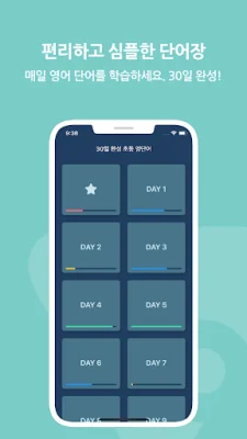 이 애플리케이션은 편리하고 심플한 디자인으로 기초 영어 단어를 간편하게 학습할 수 있는 단어장을 제공합니다. 단어장을 이용하면 30일만에 기초 영어 단어를 완벽하게 학습할 수 있습니다. 단어장은 아는 단어와 모르는 단어를 구분하여 학습할 수 있도록 도와줍니다. 또한 한 단원이 끝나면 점수를 확인할 수 있어서 학습 진도를 파악할 수 있습니다.