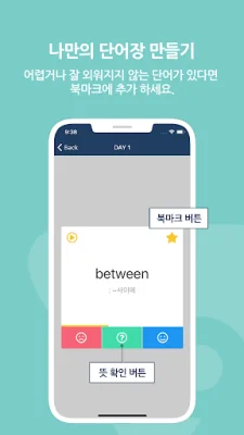 모르는 단어만 다시 학습할 수 있는 기능을 제공하기 때문에 반복적으로 학습하면 모든 단어를 외울 수 있습니다. 또한 북마크 기능을 활용하여 어렵거나 잘 외워지지 않는 단어를 추가할 수 있습니다. 이렇게 모아둔 단어들은 언제든지 볼 수 있어서 효율적인 학습을 도와줍니다.