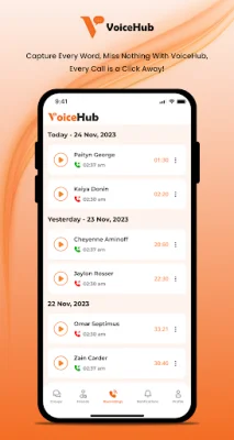 VoiceHub is an Android application that allows users to automatically record all phone calls. This eliminates the worry of missing important details in conversations and provides the convenience of being able to listen back, forward, or delete recordings at any time. It is designed to address two key issues for professionals: automatic call recording and instant sharing for feedback.