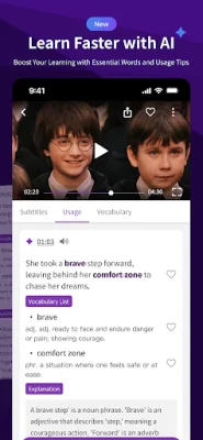 The VoiceTube app is a language learning tool that offers a variety of features to help users improve their English skills. It includes a daily selection of videos with practical English usage, carefully chosen vocabulary and phrases, and a systematic review system to enhance learning. Users can also practice their pronunciation through continuous imitation and correction, with the help of AI-based pronunciation analysis. The app also offers unlimited views of well-subtitled videos in various genres, making it easy to gain full comprehension of the content.