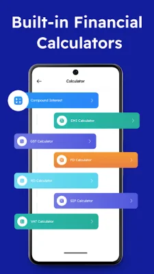 The app also includes built-in calculators for everyday financial planning, such as compound interest, EMI, GST, VAT, fixed deposit, recurring deposit, and SIP calculators. These tools allow you to perform quick calculations without leaving the app.