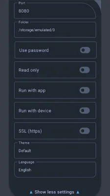 This application is designed to make file management easier and more secure for users. It does this by deploying a local WebDav/FTP server, which allows for easy access and organization of files. With this application, users can set a password to protect their files, select any folder on their device for file storage, and even enable a secure TLS connection for added security.