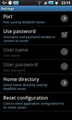 The application requires certain permissions to function properly. These include INTERNET, ACCESS_NETWORK_STATE, ACCESS_WIFI_STATE, WRITE_EXTERNAL_STORAGE, and WAKE_LOCK. The network permissions allow the server to communicate with WebDAV clients, while the WRITE_EXTERNAL_STORAGE permission enables the server to write received files from clients onto the device's SD card. The WAKE_LOCK permission keeps the device awake while the server is running, as it cannot be accessed if the device is asleep.