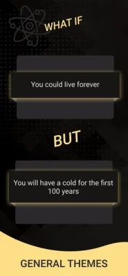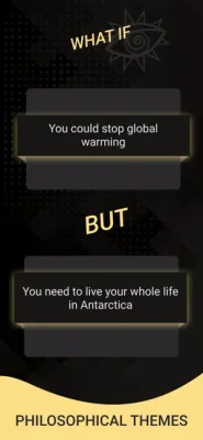 What if you could eliminate your biggest fear, but had to pass it on to your best friend? What if there was world peace, but the Internet disappeared? What if you could read people's thoughts, but only when you were completely naked? These are just some of the thought-provoking questions that you can answer with a simple "yes" or "no" in this unique application. Not only can you see how others have answered, but you can also compare your responses with theirs and share interesting questions with your friends. So, are you ready to make up your mind?