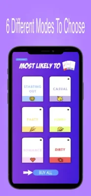 Most Likely To offers six different modes to cater to different types of gatherings and players. The Starting Out mode is perfect for those who are new to the game, while the Casual mode is great for a laid-back and relaxed atmosphere. The Party mode is ideal for larger groups and more energetic gatherings, while the Funny mode is sure to bring out the laughter in everyone. The Romantic and Dirty modes are better suited for more intimate gatherings and are not recommended for younger players.