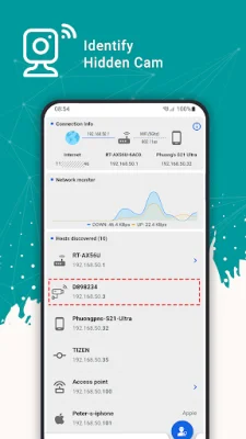 In addition to detecting intruders, this application also provides detailed information on each connected device. You can see the type of device, such as a smartphone or laptop, as well as its IP address and vendor. This allows you to have a better understanding of what devices are connected to your network and take appropriate action if needed.