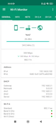 This application, version 1.6.5, provides information about Wi-Fi connections. To access the public IP address, simply click on the internet/earth icon. The app also includes a list of available Wi-Fi networks and allows for filtering of results. For Android 11+ and most routers, extra information such as model and vendor is available, including channels, country, streams, and extensions in the PRO version.
