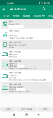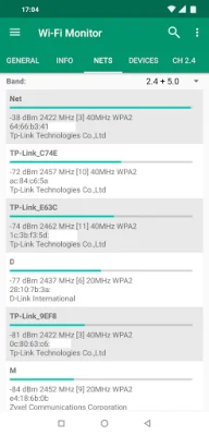 In addition to Wi-Fi networks, the app also displays a chart with power for each network at a specific time interval. It also provides information about devices connected to the Wi-Fi network, with the option for a quick scan in the subnet a.b.c.x or a deep scan in the subnet a.b.x.x for Android 13 and lower. The app also attempts to detect the hostname and router model and allows for filtering of results. On Android 13+, the standard method for detecting devices is not available, so the app tries to find used IP addresses and users can increase the timeout by pressing the "..." button.