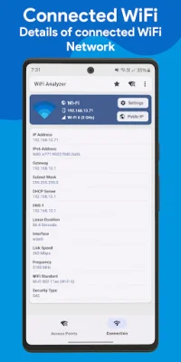 Another key feature of WiFi Analyzer is its ability to detect all devices connected to the local network. This includes identifying devices by IP address and device name, monitoring unknown or unauthorized devices, and tracking connected devices in real-time. This feature is especially useful for improving WiFi and network security by knowing exactly who is connected to the network and identifying potential risks.