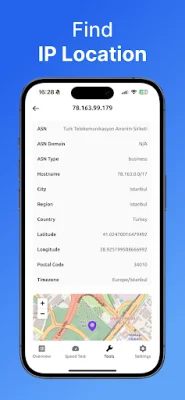 WiFi Analyzer - Speed Test also includes an IP location finder, which makes it easy to discover the location and additional information of any IP address. This can be useful for identifying potential security threats or monitoring network activity.