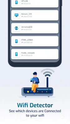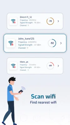 The second feature, WiFi scanner, allows you to detect how others are using your WiFi connection. This can be useful for monitoring and managing your network's usage. The WiFi scan feature allows you to scan for nearby available WiFi connections and view information such as frequency, signal strength, channel number, signal health, and whether the connection is secure.