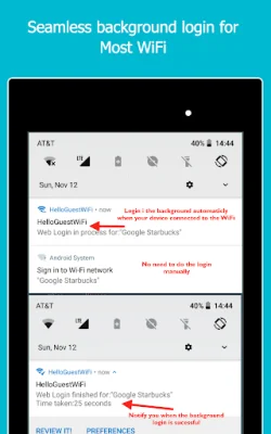 HelloGuestWiFi is an application that allows users to save their login information for WiFi networks that require usernames, emails, or passwords. This means that users no longer have to manually enter their login details every time they want to connect to these networks. Instead, they can save their information once and HelloGuestWiFi will automatically log them in when they return to the network. This eliminates the frustration of having to constantly re-authenticate and deal with annoying portal screens.