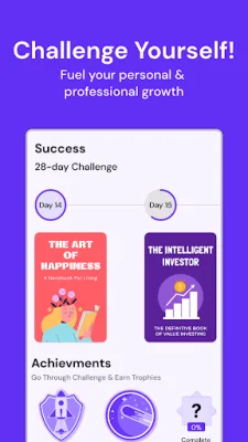 The app offers microlearning with book and podcast summaries, providing key insights from the best books, courses, and podcasts in just 15 minutes. Users can choose to listen or read the summaries, with over 1500 options available for learning and personal growth. The app also offers highly personalized challenges to push users towards their goals, such as a 7-Day Peak Productivity Challenge or a 9-Day Healthy Lifestyle Challenge. Users can track their progress and stay motivated on their growth journey.