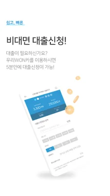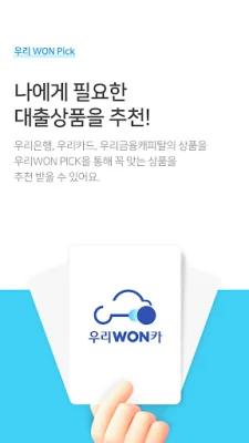 우리WON카 앱은 은행, 카드, 캐피탈에서 발품없이 한번에 최저금리와 최대한도를 찾아주는 서비스입니다. 이를 통해 사용자는 자신에게 가장 적합한 대출 상품을 쉽게 찾을 수 있습니다. 또한 우리WON카는 사용자에게 맞는 상품을 추천해주고, 한도와 금리를 간편하게 알려주는 기능을 제공합니다. 이를 통해 사용자는 복잡한 대출 상품 정보를 쉽게 이해할 수 있습니다.