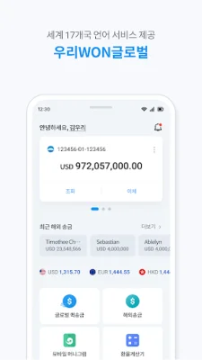 The Woori WON Global app is designed for international customers, including migrant workers and international students. It supports 17 languages and offers various features such as checking account balances, transferring funds, making international transfers, and withdrawing money.