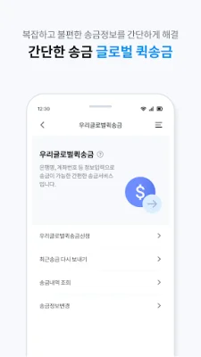 For international transfers, the app offers various options such as 'Global Quick Transfer,' 'Woori WING International Transfers,' Mobile MoneyGram, 'Woori ONE International Transfers,' and Direct International Transfers. Additionally, the app is integrated with Woori WON Banking, allowing users to access their accounts in different banks and explore a diverse range of banking products.