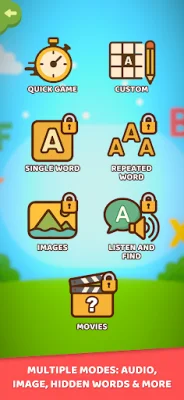 The app offers multiple game modes, including Quick Game, Custom Game, One Word Mode, Repeat Word Mode, Image Mode, Audio Mode, Hidden Words Mode, and Movie Mode. These modes cater to diverse abilities and help children develop cognitive and language skills in ways that suit their preferred learning style.