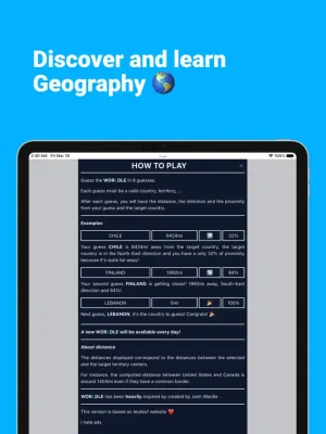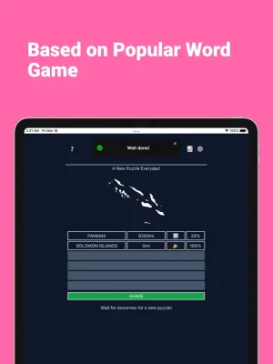 This application provides a new puzzle every day, featuring a map of a country or territory. The goal is to correctly identify the location on the map, and if the answer is incorrect, the app will provide feedback on how close the guess was and in which direction the correct answer lies. Players have six chances to guess correctly, and if they are unsuccessful, they will have to wait until the next day for a new puzzle.