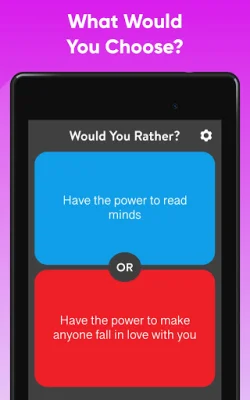 In summary, Would You Rather Choose is a fun and versatile application that offers endless entertainment for groups of friends and family. With its large selection of questions, real-time statistics, and offline capabilities, it's the perfect game to play in any setting. So gather your friends and family, and start playing this exciting and thought-provoking game today!