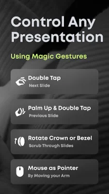 One of the standout features of WowMouse Presenter is the ability to double tap to advance slides. This means you can simply tap your thumb and index finger together to move forward, without having to fiddle with buttons or clickers. Similarly, you can use a palm up and double tap gesture to go back, making it a simple and smooth process.