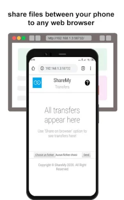 Sharemy also offers a web browser sharing option, allowing you to transfer files from your web browser to any phone. This makes it a convenient tool for sharing files with others, even if they do not have the app installed on their device. With Sharemy, you can also discover nearby users and easily share your own photos, videos, and music with them.