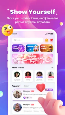 But the fun doesn't stop there. You can also create your own online party room and invite your friends to join for activities like singing competitions and games. And for more intimate conversations, you can add your favorite friends to your contact list and have private voice and text chats, as well as share photos.