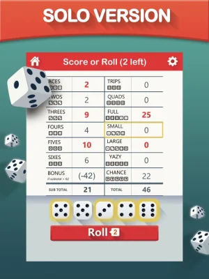 The game features a comprehensive tutorial for new players, making it easy for anyone to pick up and play. The interface is also user-friendly and customizable, with options to change the color of your dice. Yatzy offers four different playing options: a solo game, a longer three-column game, playing against a robot opponent, and a local pass and play option for playing with friends on the same device.