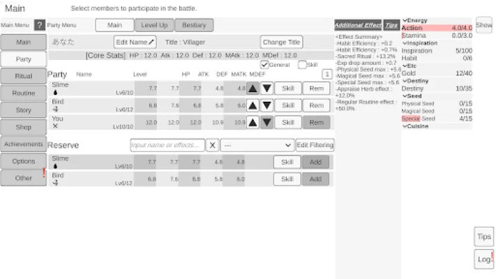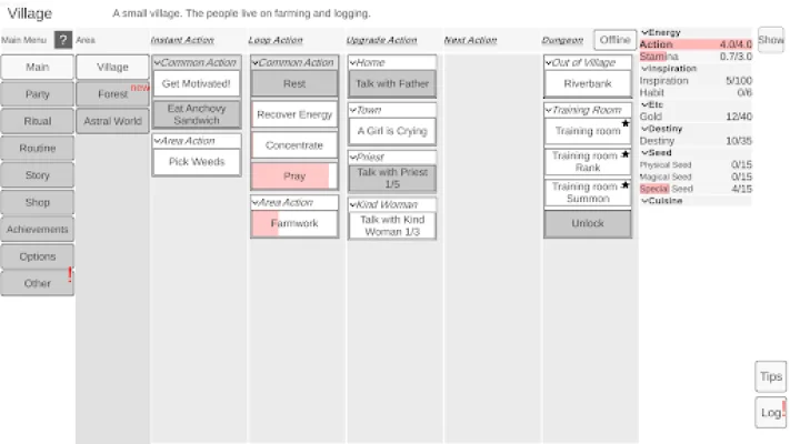 The game features action buttons that allow players to select their actions and enhance their abilities. In addition, there are automated battles in the Dungeon, a system to summon and strengthen monsters, and the ability to equip and upgrade summoned monsters with skills and equipment. The Routine upgrade system also provides offline bonuses, making it possible for players to progress even when the game is not actively being played. As players advance through the game, they can unlock additional features to enhance their gameplay experience.