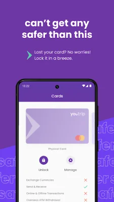 With YouTrip, you can also rest assured that your transactions are safe and secure. You can instantly lock and secure your card with just one tap and receive push notifications for every payment, allowing you to stay on top of your transactions. This gives you peace of mind while using your YouTrip account for all your overseas payments.