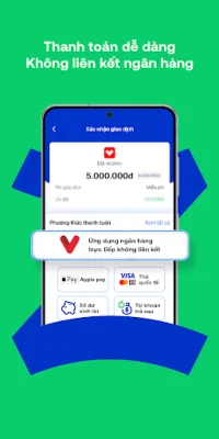 Ứng dụng này cung cấp phương thức thanh toán dễ dàng mà không cần liên kết với ngân hàng. Bạn có thể nạp tiền vào tài khoản Zalopay theo cách truyền thống hoặc chuyển khoản trực tiếp từ các ứng dụng ngân hàng khác. Người dùng có thể lựa chọn thanh toán từ nhiều nguồn tiền khác nhau như số dư Zalopay, số dư sinh lời, tài khoản trả sau, tài khoản ngân hàng đã liên kết, chuyển khoản trực tiếp từ ứng dụng ngân hàng, Apple Pay, Visa, Mastercard và nhiều hơn nữa.