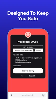 Zerion Wallet is designed with security in mind. It automatically detects known phishing websites and apps, and allows you to preview your onchain transactions before signing them, ensuring that you know exactly what you're agreeing to.