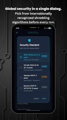 What sets ZeroFill apart from other data deletion apps? For one, we offer a variety of global data destruction standards used by security agencies worldwide, including the US DoD 5220.22-M, Gutmann Method, NIST 800-88, and more. You can choose the level of security that best suits your needs. Additionally, ZeroFill offers three powerful shredding modes: shredding specific files and folders, wiping empty space to remove hidden leftovers, and wiping full storage for a complete digital factory reset.